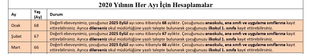 1.SINIF OKULA KAYIT YAŞI TABLOSU